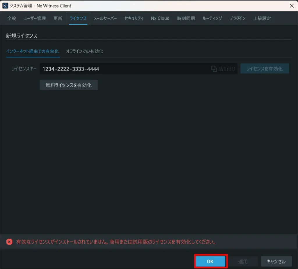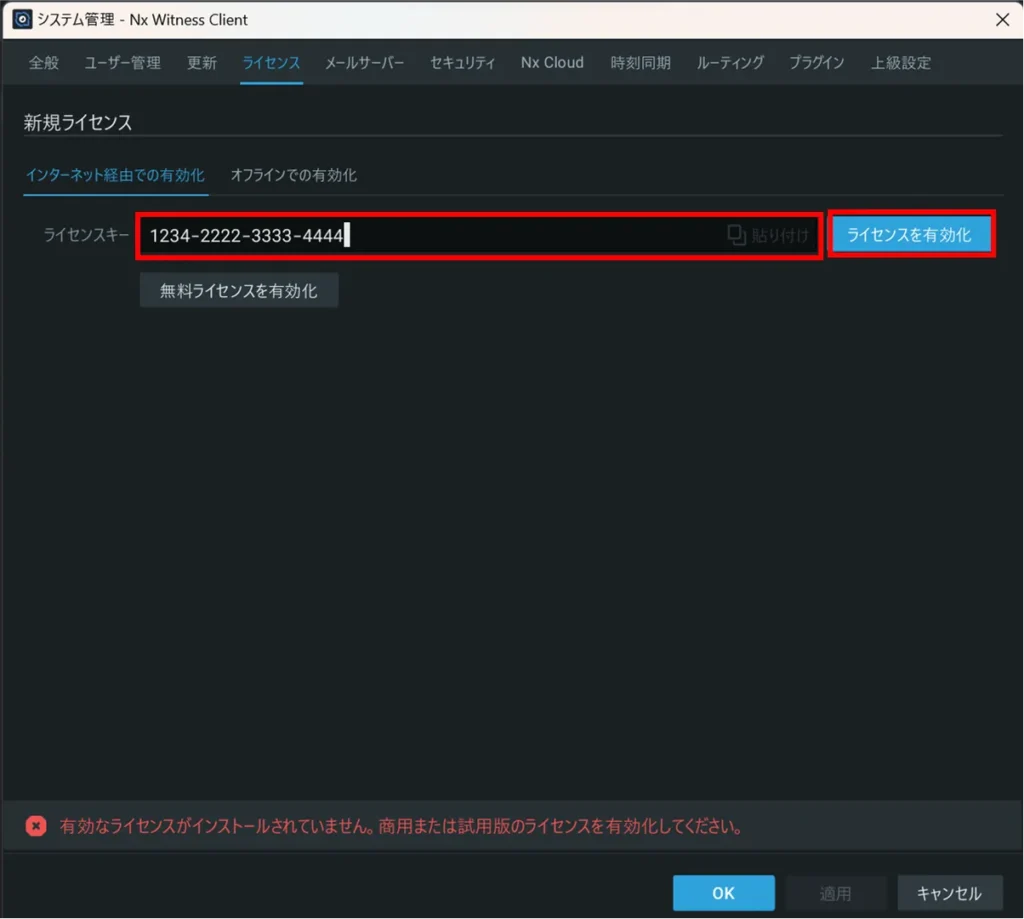 「 ライセンス 」タブ >「 インターネット経由での有効化 」タブにて、ライセンスキーの値を入力し、[ ライセンスを有効化 ]をクリックします。