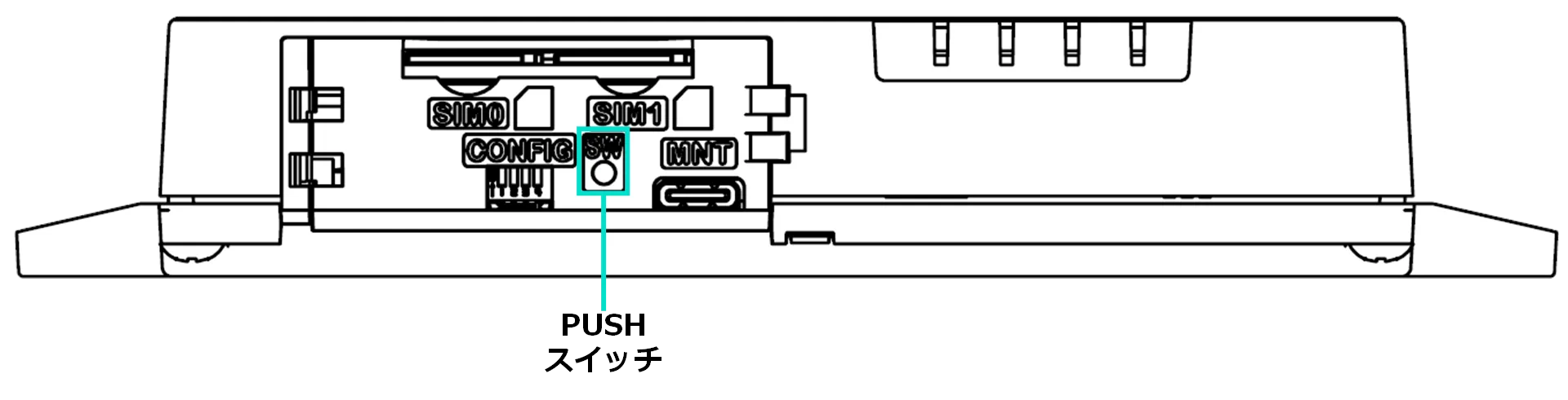 - 機器が動作中(起動プロセスは終了し完全に立ち上がった状態)に、本体の PUSH スイッチを先端の尖った細いもので3秒以上押し込むことで、電源をOFFにする