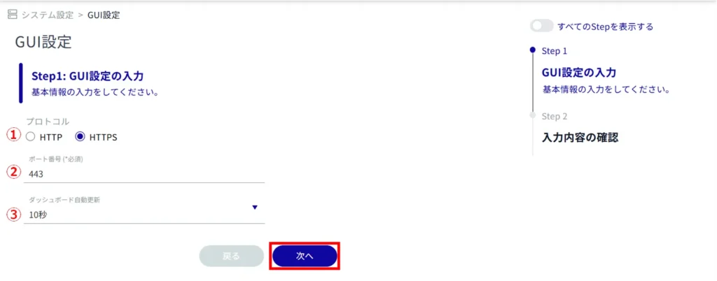 GUI 設定の基本情報について、以下の①~③を設定し[ 次へ ]をクリックします。