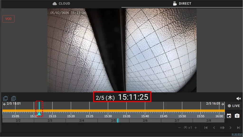 過去映像再生中、映像ビュー中央にある時刻(再生中の動画の時刻)クリックします。
