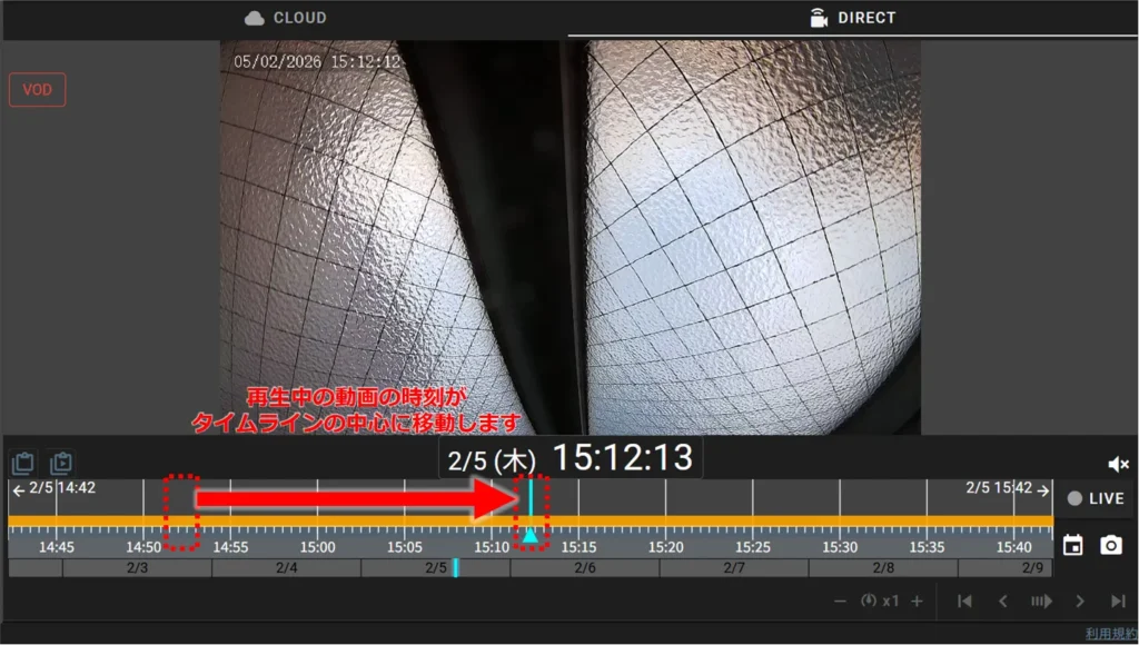 『カメラ詳細』画面では、過去映像を再生する際、再生中の時刻をタイムラインの中央に表示できます。