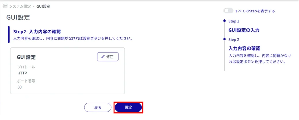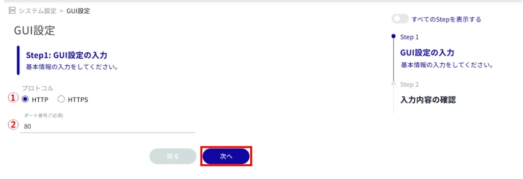 Set the following items (1) to (2) for basic information on GUI settings and click Next.