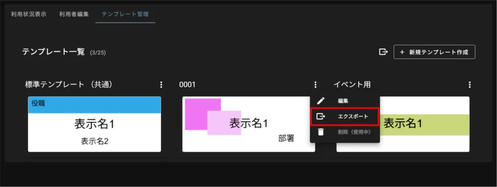 On the "Template Management" tab, click [⋮] on the nameplate template you wish to export from the "Template List" and select [ Export ] from the operation menu that appears.